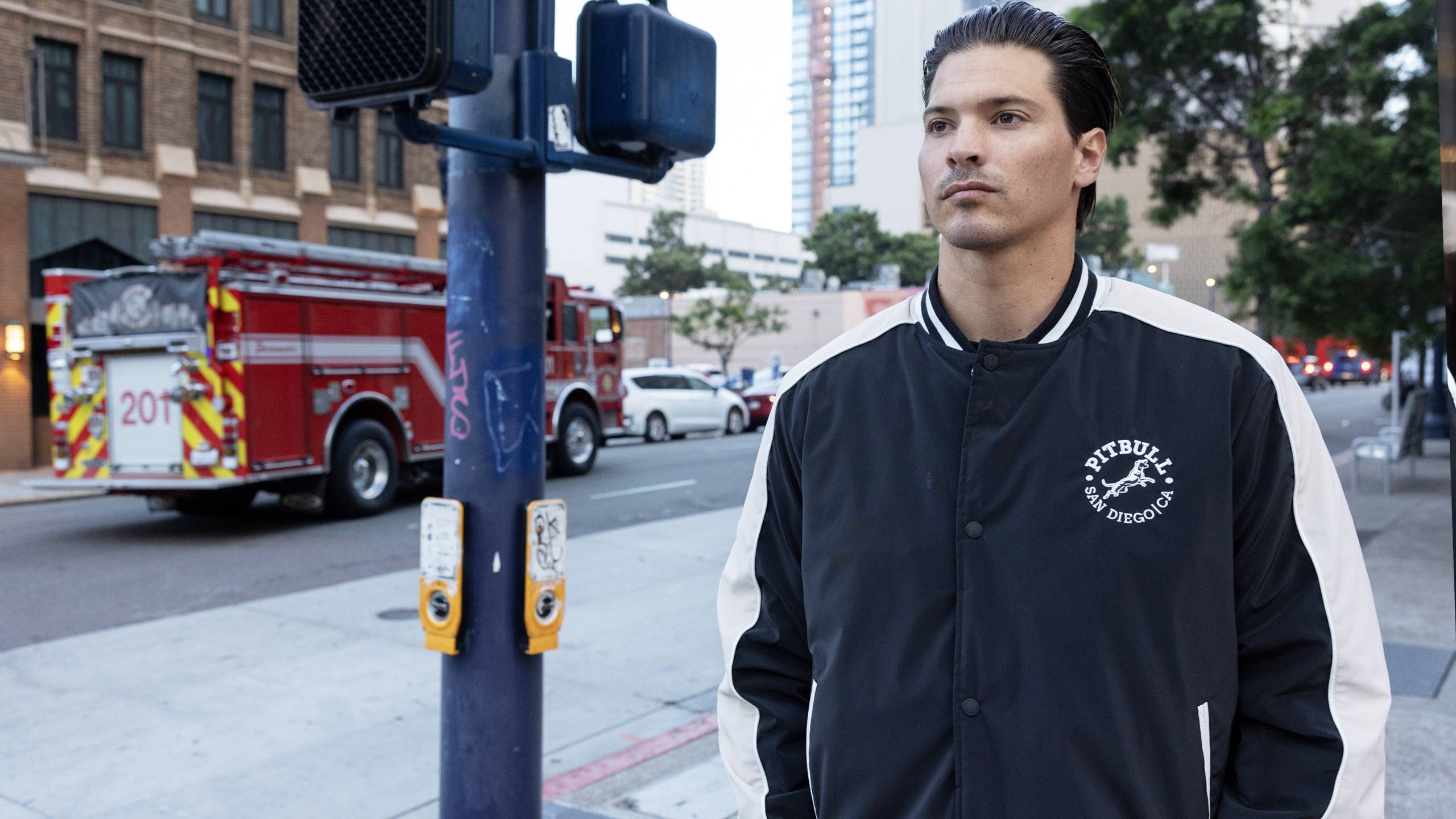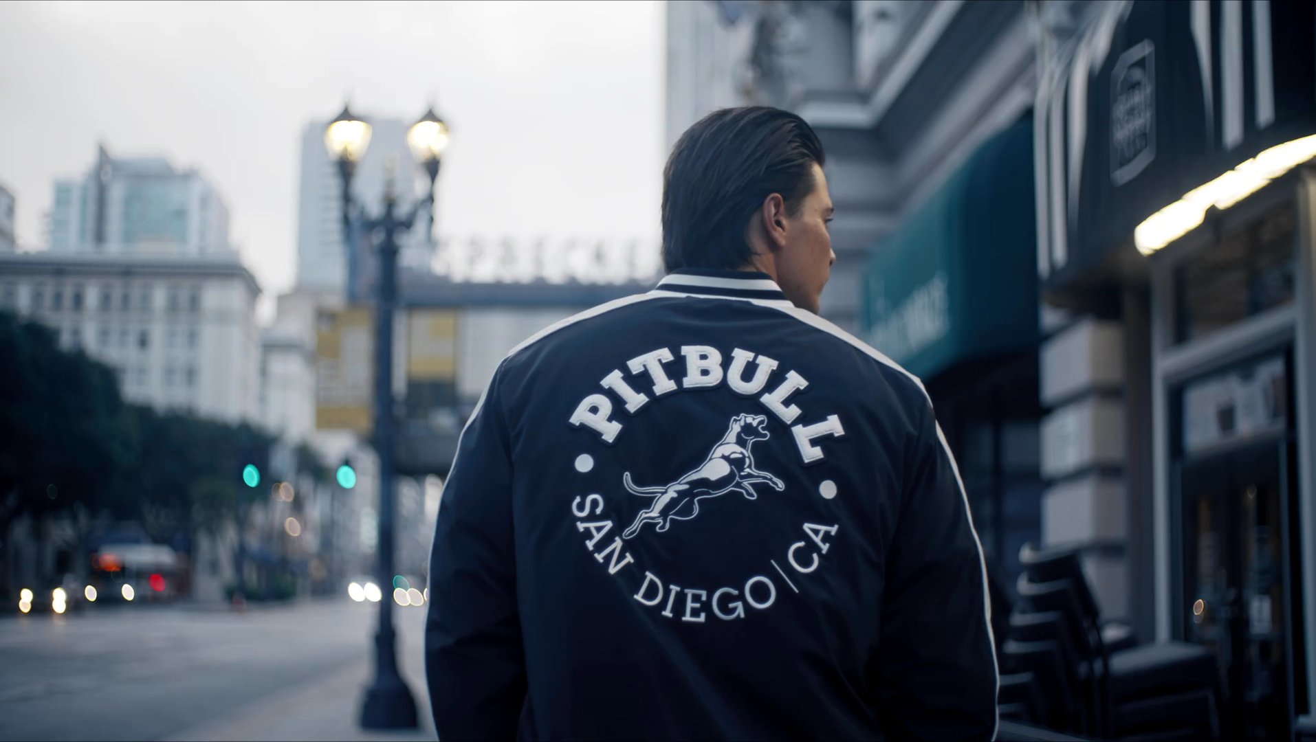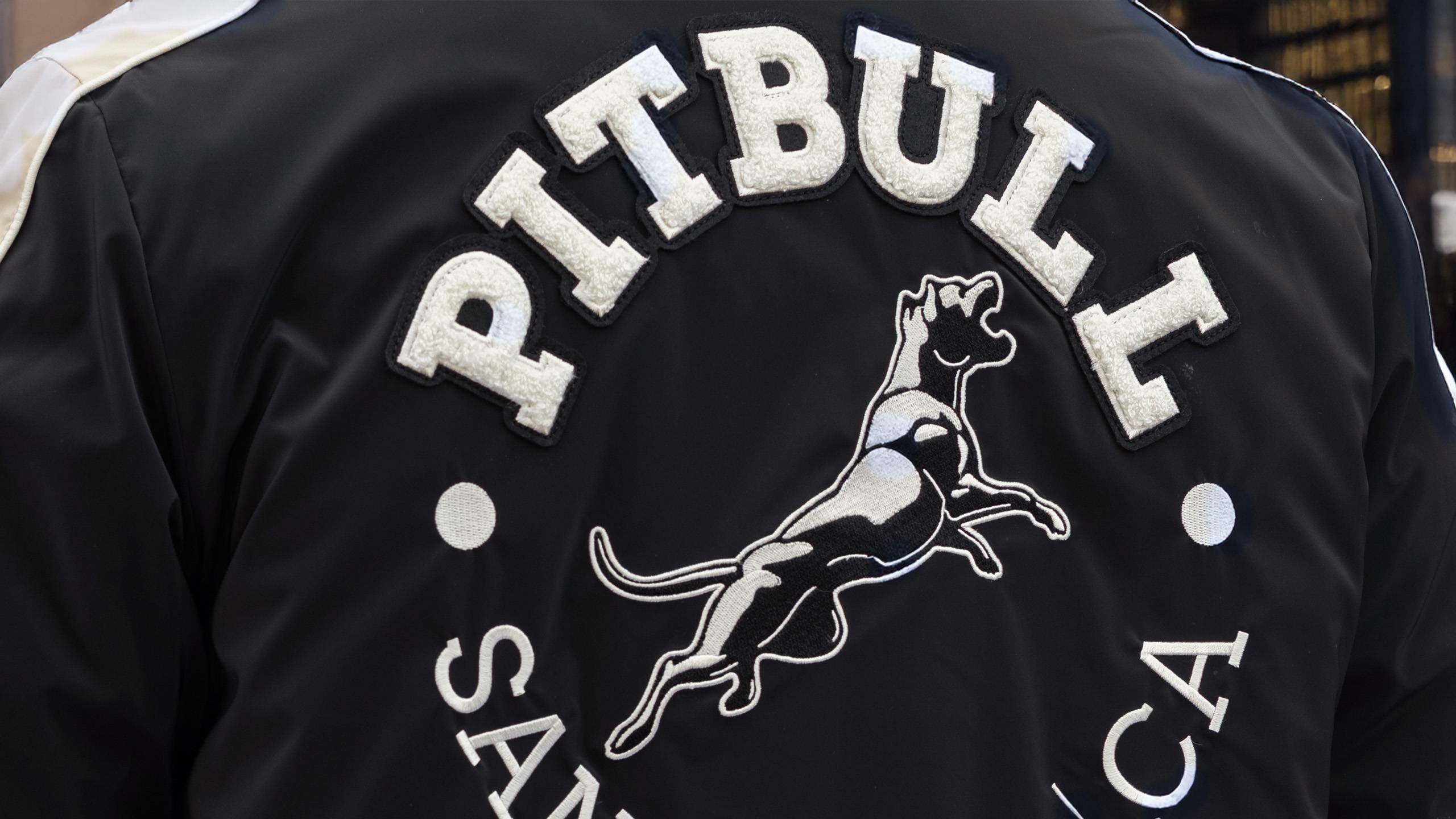 - große aufgenähte PITBULL-Buchstaben auf dem Rücken und kleine auf der Brust